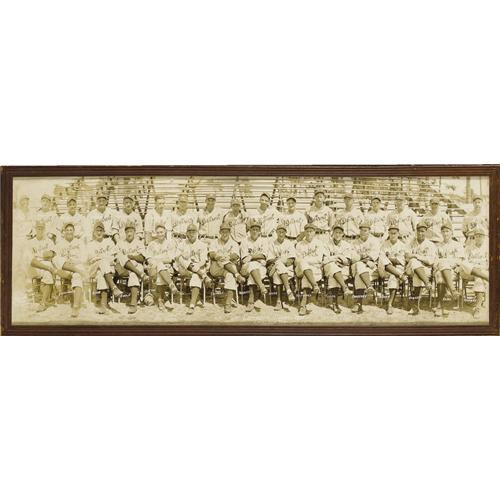 <B>1935 Detroit Tigers Panoramic Photograph.</B></I> The eventual World Champions pose for the camera at their Lakeland, Florida Spring Training grounds at the onset of that historic season. The photo was once the prized possession of Bob "Suitcase" Seeds, who appears standing fifth from left, and whose signed baseballs and photos also appear within this auction. Though Seeds may not be a household name today, several of his teammates pictured surely are, notably Greenberg, Goslin, Cochrane and Gehringer, all of whom boast Hall of Fame credentials. Having never seen an example of this image before, we can only surmise that the production run was limited to players and staff, making this Championship team panorama all the more appealing. The sepia image exhibits a few vertical creases and some mild fading at the edges, but the overall visual effect is very strong and is not hampered by these concerns. Image measures 7.75x22.5" in original frame.<BR><BR><b>Shipping:</b> Framed (<a target="_blank" href="http://www.heritageauctions.com/common/shipping.php">view shipping information</a>)