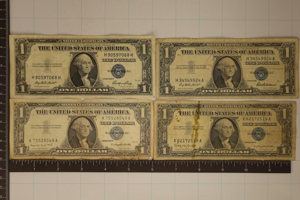 BLUE SEALS, ONE HAS PARTIAL INK STAMP ON  OBVERSE, ONE HAS TATTERED EDGES AND ONE HAS  OLD GLUE RESIDUE ON OBVERSE