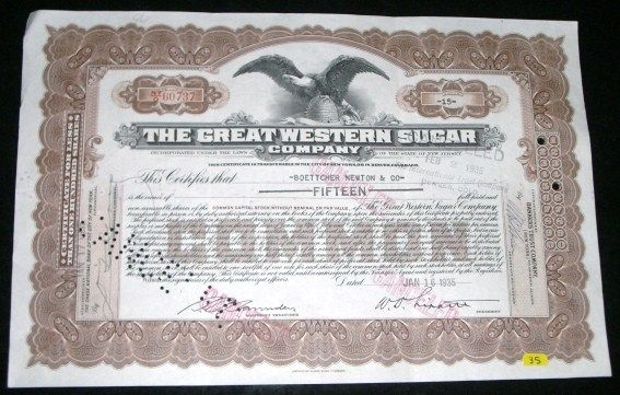 1935 EXTREMELY RARE 15 SHARES STOCK CERTIFICATE *THE GREAT WESTERN SUGAR COMPANY* NICE STOCK CERTIFICATE!! ***Coin, Currency & All Items Listed in this auction - Grades, Conditions and Values are not Safe Deposit Coins LLC Responsibilty. Grades, Condition and Values are determined by Consigner(s) & Buyers ONLY