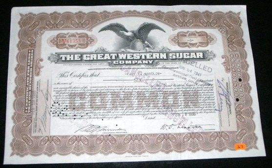 1935 EXTREMELY RARE 6 SHARES STOCK CERTIFICATE *THE GREAT WESTERN SUGAR COMPANY* NICE STOCK CERTIFICATE!! ***Coin, Currency & All Items Listed in this auction - Grades, Conditions and Values are not Safe Deposit Coins LLC Responsibilty. Grades, Condition and Values are determined by Consigner(s) & Buyers ONLY