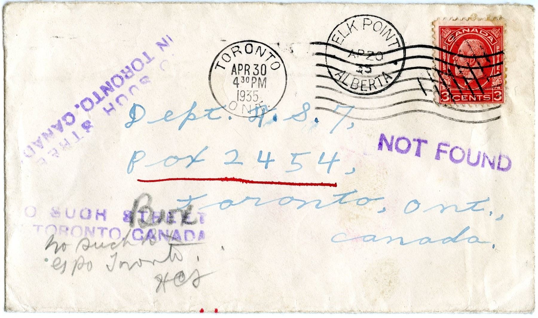 1935 Envelope with 3 cent stamp from Elk Point AB to Toronto ON, Envelope is covered with return, not found post marks