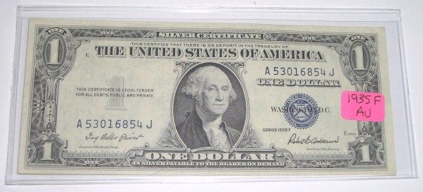 1935 F SERIES $1 SILVER CERTIFICATE BILL SERIAL # A53016854J *EXTREMELY RARE AU HIGH GRADE*!! ***Coin, Currency & All Items Listed in this auction - Grades, Conditions and Values are not Safe Deposit Coins LLC Responsibilty. Grades, Condition and Values are determined by Consigner(s) & Buyers ONLY