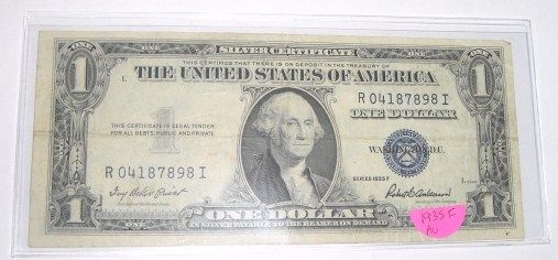 1935 F SERIES $1 SILVER CERTIFICATE SERIAL # R04187898I *EXTREMELY RARE AU HIGH GRADE*!! ***Coin, Currency & All Items Listed in this auction - Grades, Conditions and Values are not Safe Deposit Coins LLC Responsibilty. Grades, Condition and Values are determined by Consigner(s) & Buyers ONLY