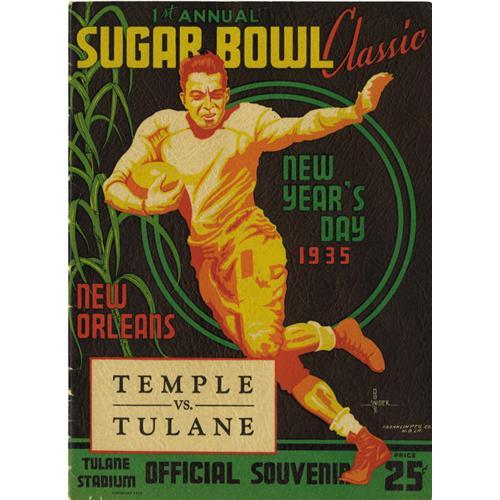 <B>1935 First Annual Sugar Bowl Program.</B></I> Recounting happier days in New Orleans than we have seen recently is this remarkably fine program issued to fans at the very first occurrence of this historic collegiate football event. Only light touches of wear dot the spine and corners of this Depression era keepsake, boasting unbeatable cover graphics and announcing the battling parties as Temple and hometown favorites Tulane. Most of the few surviving specimens of this program tend to come out of the New Orleans area, and typically suffer for the humid environment in which they passed the seven decades since issue. This specimen certainly rates as one of the finest of the tiny available supply. <BR><BR><B>Important notice:</B> Heritage usually auctions material at the rate of 200-250 lots per hour. On some occasions eBay Live bid software or the Internet may not be able to keep up with the pace of the auction. We recommend placing a realistic absentee bid now as insurance to avoid disappointment. Occasionally the auctioneer may eliminate or reject an eBay Live bid, and the auctioneer may also reopen a lot after the close of the eBay live bidding (usually because we missed an audience bid), and may reject your bid even if it shows you as the winning bidder. By bidding via eBay Live, you agree that Heritage may award the lot to another bidder at its sole discretion under the circumstances described above or any other reasonable circumstances. Since eBay bids are not shown to us until we open the lot on the floor, we treat those bids just like floor bids. In most cases the floor responds before the eBay bid is presented to us, due to Internet lag time, so for consistency we have made it a policy that floor bids are always considered first over tie eBay live bids. Also please note that all Heritage lots purchased through eBay Live carry a 22.5% Buyer's Premium. Please make sure you read the Terms and Conditions before you bid. This lot is being auctioned in conjunction with a live floor auction by Heritage Galleries & Auctioneers. All final auction and invoice information will be supplied by Heritage Galleries & Auctioneers, and all other information should be considered preliminary. Lot:19251 <BR><BR><B>Winning Notification and Billing:</B> After the FINAL session in this auction is complete, Heritage will send e-mail and snail mail invoices. This process normally takes several days. All final auction and invoice information will be supplied by Heritage Galleries & Auctioneers, and all other information should be considered preliminary. <BR><BR>This auction will be conducted on a live auction floor and over the Internet through eBay Live. If you choose to place an absentee bid, please take a moment to <font color='#0000ff'><u><a href='http://pages.ebay.com/liveauctions/help/before/laabsentee.html'>learn how eBay Live absentee bidding works</a></u></font><font color='#000000'>
