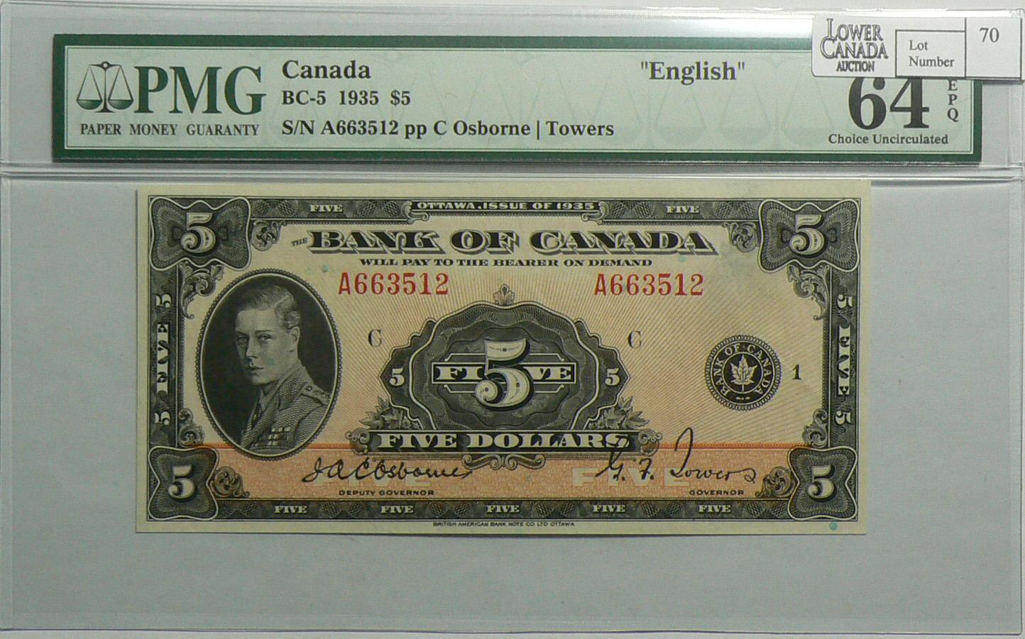 1935 Five Dollars English, BC-5, PMG UNC-64, Osborne Towers, Letter C, serial A663512.