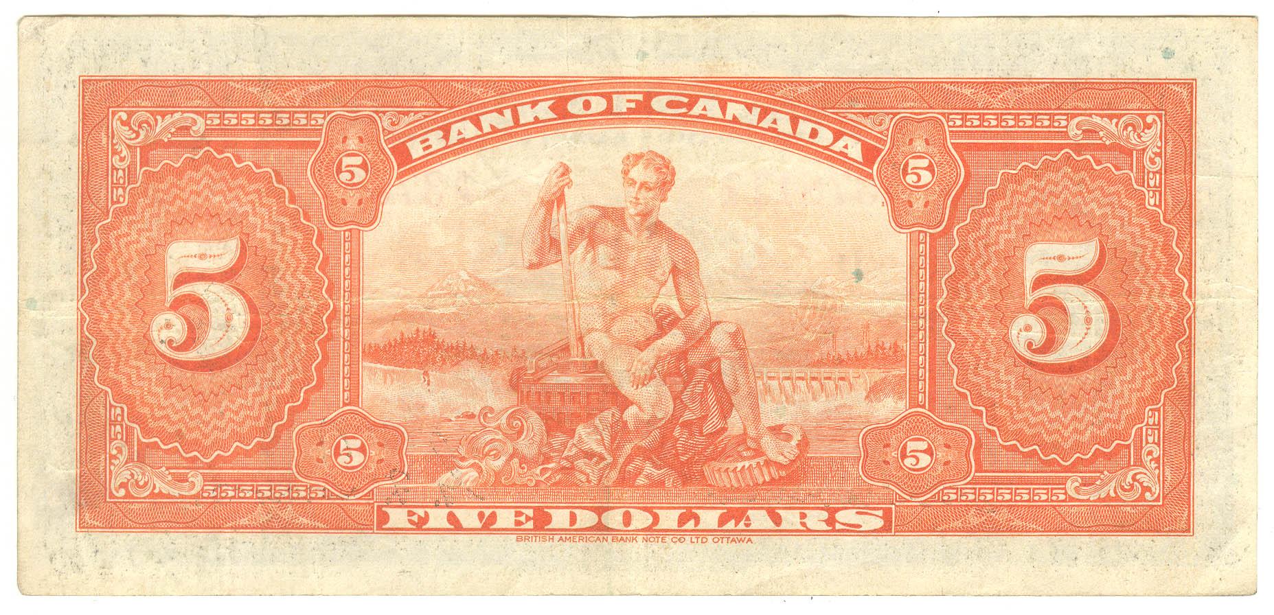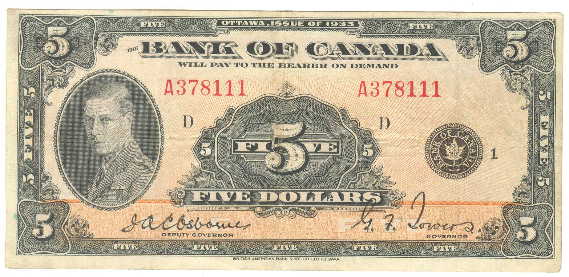 1935 Five Dollars English, BC-5, VF, Osborne Towers, Letter D, serial A378111.