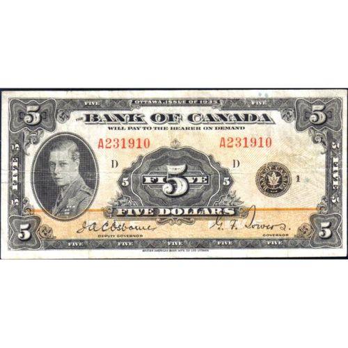 1935 Five Dollars, English, BC-5 Serial Number A231910 D, VF