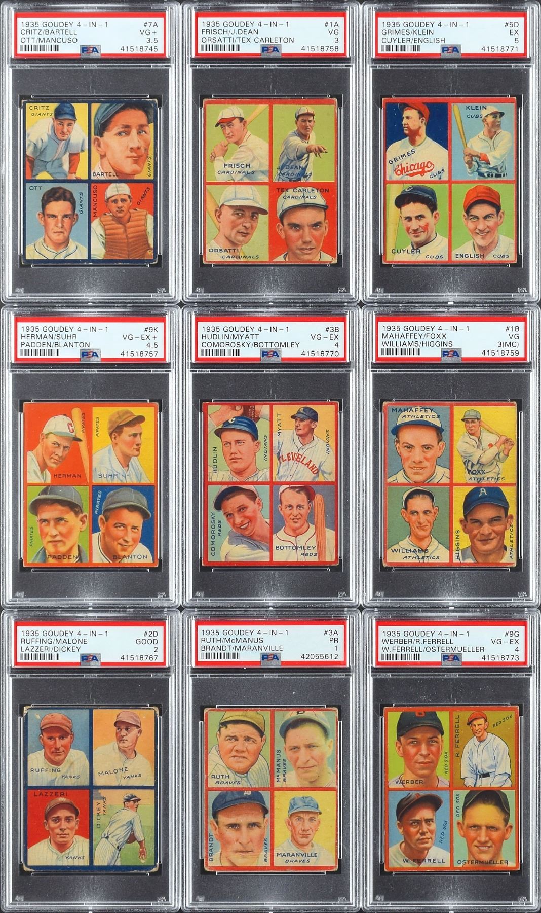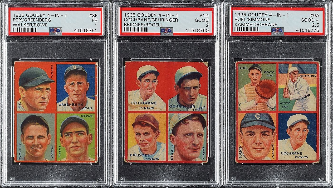 Offered is a complete set of 1935 Goudey cards, with each card PSA graded! Comprised of 36 cards with different fronts, each card featuring a quartet of players…including Babe Ruth! However, the backs of these cards have nine separate puzzle combinations depicting individual players like Mickey Cochrane, Frankie Frisch, and Jimmie Foxx, among others as well as teams like the Detroit Tigers, Cleveland Indians, and Washington Senators. There are 36 different card fronts, each of which has between two and four different puzzle-piece backs. In all, while a set is considered complete at 36 card fronts, there are 114 different front/back combinations. The entire set has been registered on the PSA website, and is ranked as the 23rd finest set.