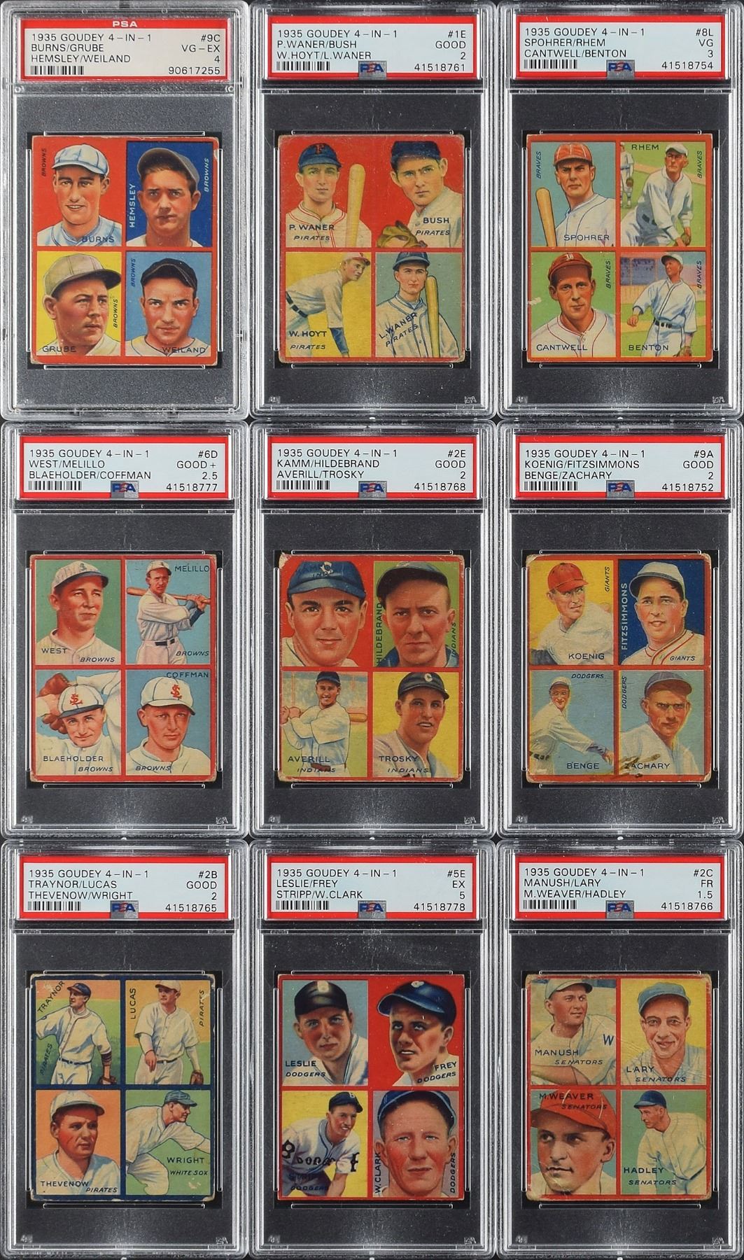 PSA GOOD 2 - 9 cards with #1I Earnshaw/Dykes/L. Sewell/Appling, #1E Waner/Bush/Hoyt/Waner, #1D Cochrane/Gehringer/Bridges/Rogell, #9A Koenig/Fitzsimmons/Benge/Zachary, #7E Moore/Hogan/Frankhouse/Brandt, #2B Traynor/Lucas/Thevenow/Wright, #2D Ruffing/Malone/Lazzeri/Dickey, #2E Kamm/Hildebrand/Averill/Trosky and #3F Schuble/Marberry/Goslin/Crowder,