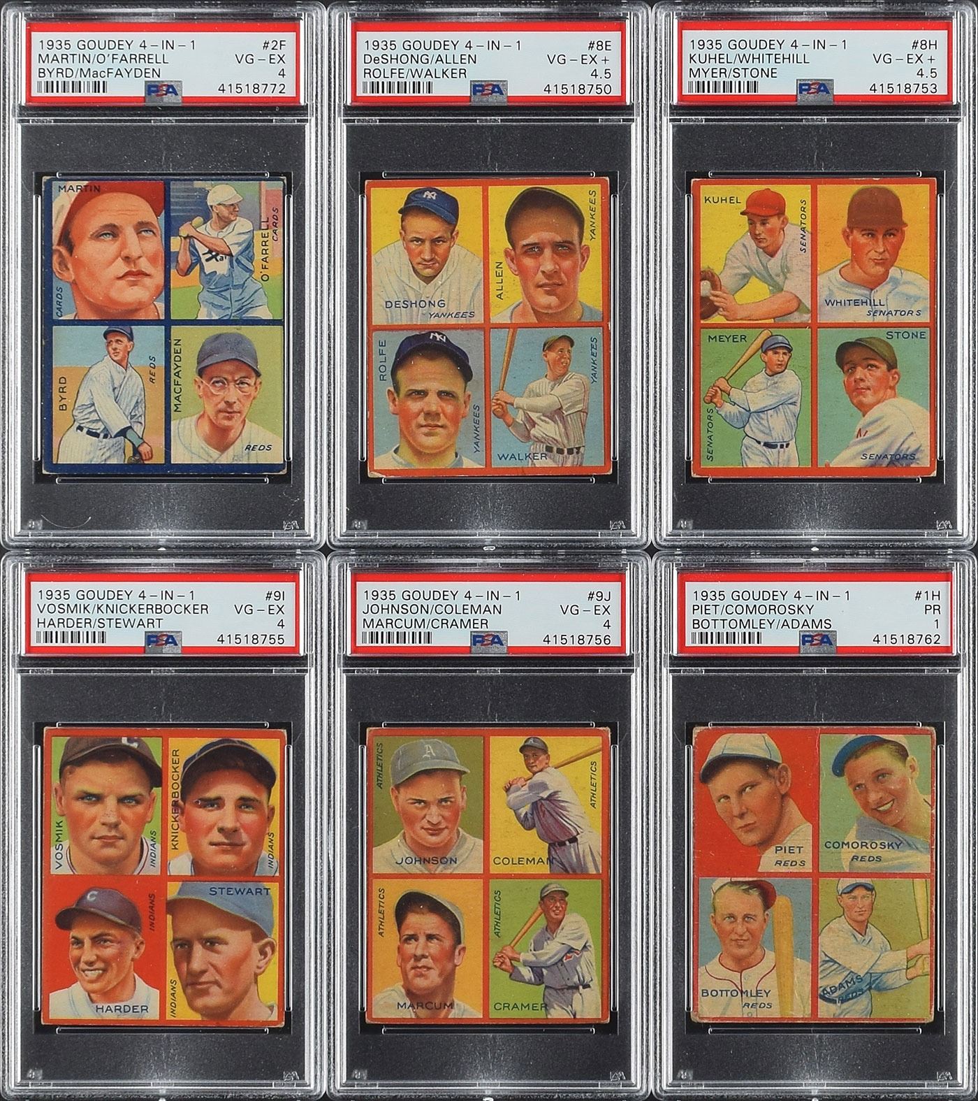 PSA VG-EX 4 - 6 cards with #9C Burns/Hemsley, 9J Johnson/Coleman/Marcum/Cramer, #9I Vosmik/Knickerbocker/Harder/Stewart, #3B Hudlin/Myatt/Comorosky/Bottomley, #2F Martin/O'Farrell/Byrd/MacFayden and #9G Werber/R. Ferrell/W. Ferrell/Ostermueller,