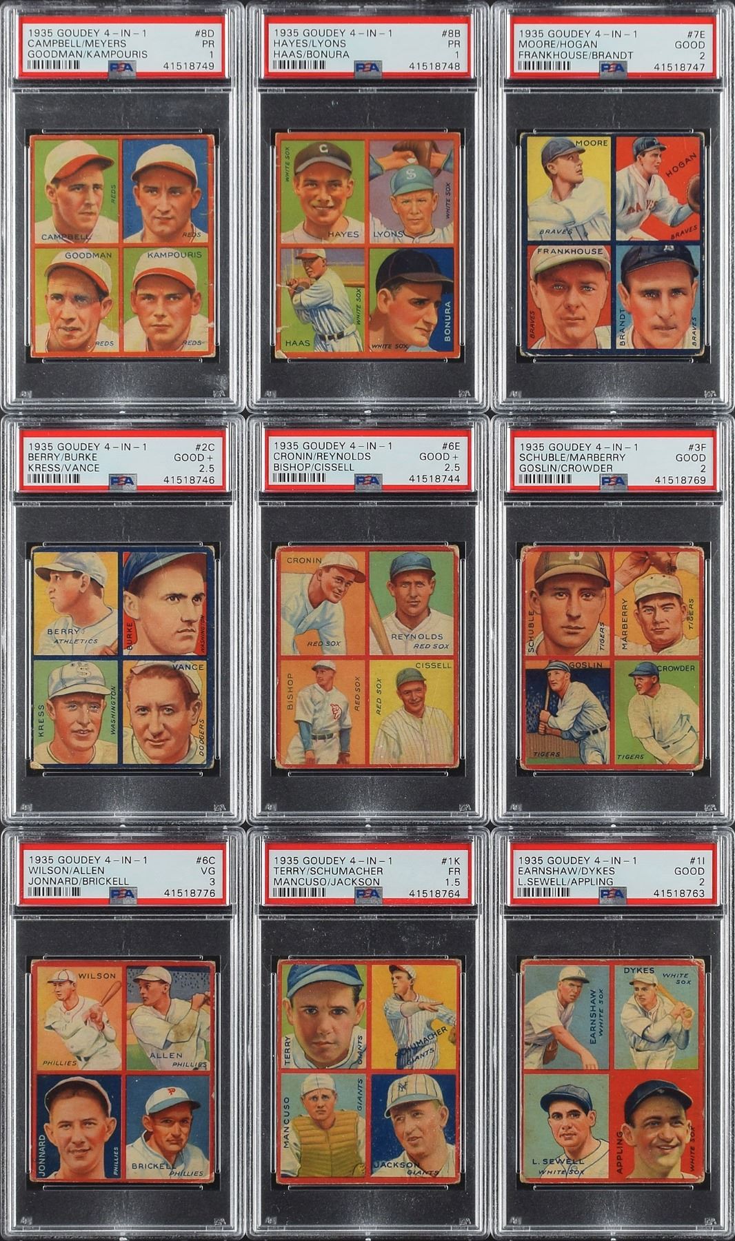 PSA GOOD+ 2.5 - 4 cards with #2C Berry/Burke/Kress/Vance, #6E Cronin/Reynolds/Bishop/Cissell, #6A Ruel/Simmons/Kamm/Cochrane, and #6D West/Melillo/Blaeholder/Coffman.