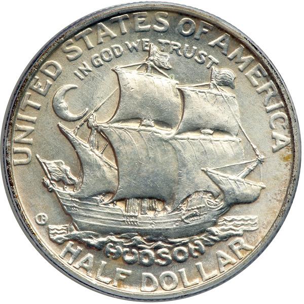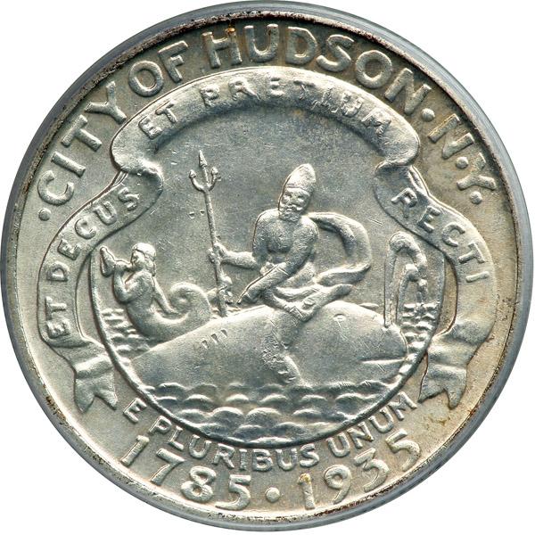 1935 Hudson Half Dollar. PCGS graded MS-63. Mostly untoned with a hint of light tone. Key date commemorative half, only 10,000 made. On the obverse, King Neptune straddles a spouting whale hind end foremost, while a triton blows a conch shell in the background (PCGS # 9312) .