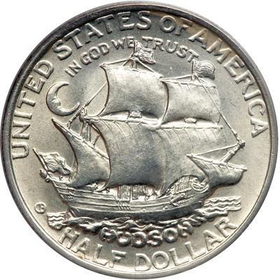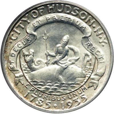 1935 Hudson Half Dollar. PCGS graded MS-65 PQ. A nice white gem. On the obverse, King Neptune straddles a spouting whale hind end foremost, while a triton blows a conch shell in the background. There were 10,000 coins struck, all sold on behalf of the "Hudson Sesquicentennial Committee" which probably consisted of the mayor and city fathers pocketing a fair amount of the proceeds. Pop 620; 198 finer, 192 in 66, 6 in 67 (PCGS # 9312).