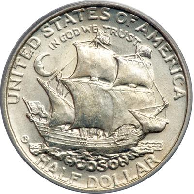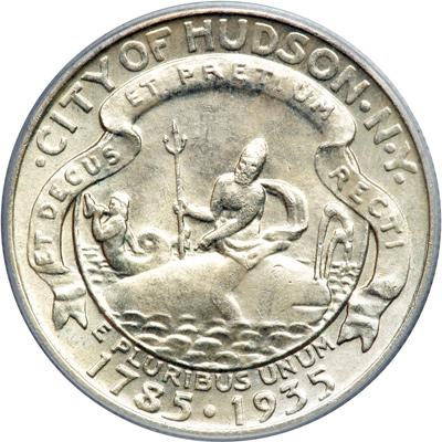 1935 Hudson Half Dollar. PCGS graded MS-64. A hint of light golden toning. King Neptune rides backwards on a tubby spouting whale -- choice surfaces give full justification to the assigned grade (PCGS # 9312) .