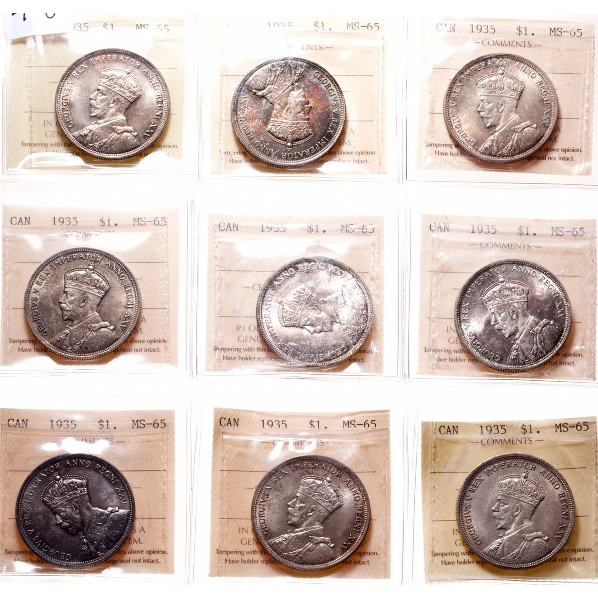 1935. ICCS Mint State-65. Lot of nine (9) Gems, each with light to medium heavy golden, pale blue or rainbow toning. An impressive accumulation of superb gem dollars.