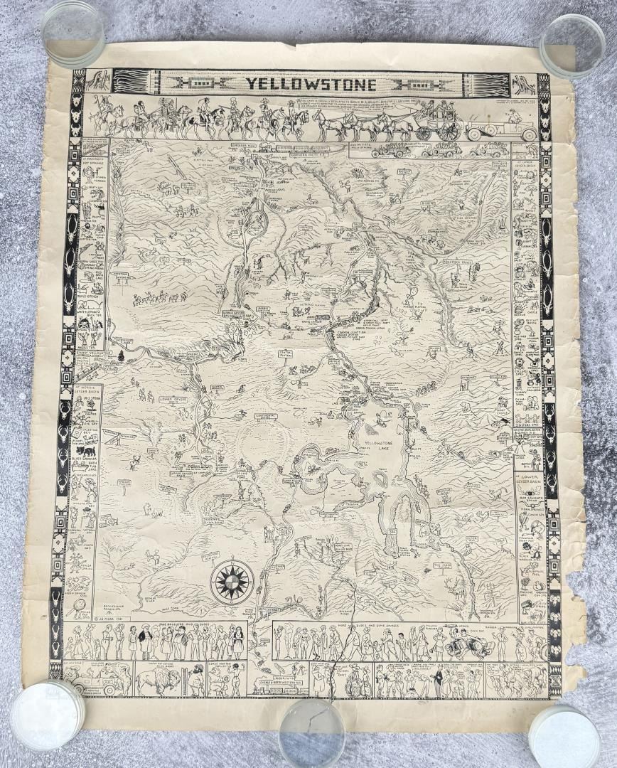 Approximately 27 1/2"x 22". Condition as shown, see edges for tears. A pictorial map of Yellowstone National Park by Jo Mora, one of the most renown American mapmakers of this genre, which he referred to as "cartes." It exhibits his characteristic whimsical touch combined with geographic and historical detail. Numerous illustrations show locations of the park’s geological features, roads, and visitor services buildings such as ranger stations, inns and campgrounds. The map is enlivened by Mora’s characteristically playful illustrations of park wildlife, people participating in park activities, and Native Americans in traditional garb. Notwithstanding the cartoony drawing style of the figures, the topography of the park with its hills and canyons is faithfully rendered as if viewed from the air. Locations are labeled with hand-lettered captions, some on illustrations of signposts.