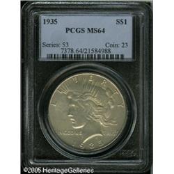 <B>1935<img border='0' src='http://www.heritagecoins.com/images/star.gif' width=10 height=10>$1 MS64 PCGS.</B></I> Soft luster shows through light gray patina. The design features are sharply struck. A few unobtrusive marks are concealed within Liberty's hair and the eagle's feathers. Lot:10747