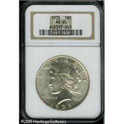 <B>1935<img border='0' src='http://www.heritagecoins.com/images/star.gif' width=10 height=10>$1 MS65 NGC.</B></I> A sharply struck Gem with light gold color and splendid preservation. An impressive example of this popular final year issue. Lot:10748