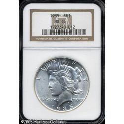 <B>1935<img border='0' src='http://www.heritagecoins.com/images/star.gif' width=10 height=10>$1 MS65 NGC.</B></I> This is a frosty and lustrous Gem with fully brilliant silver surfaces and no evidence of toning on either side. Lot:10749