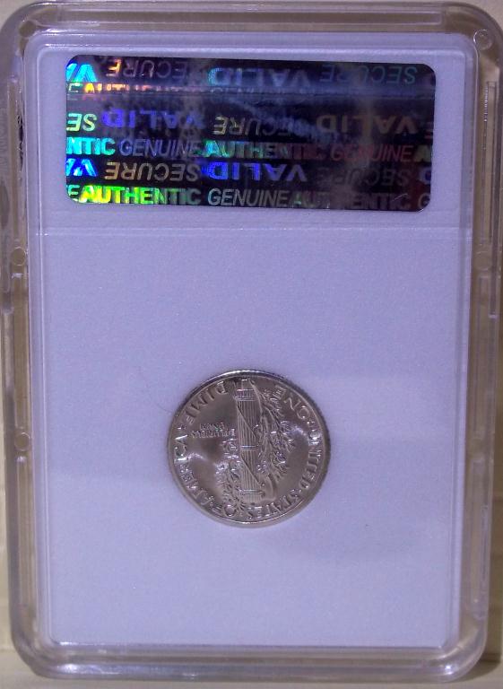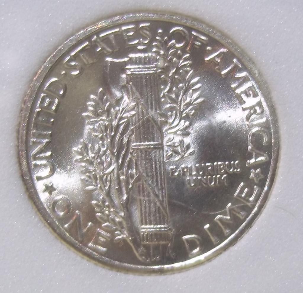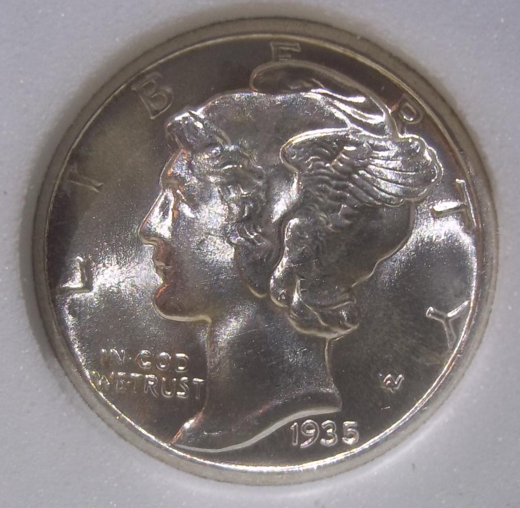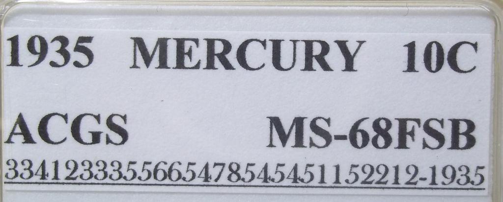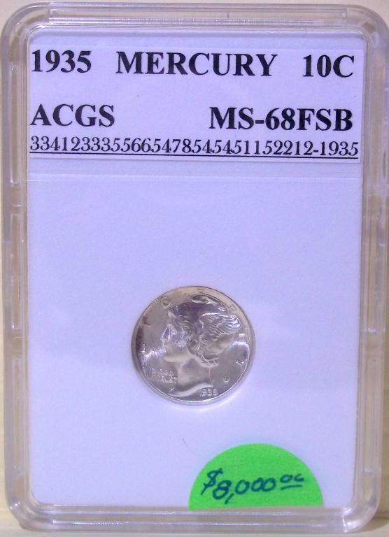 1935 Philadelphia Mint Mercury Dime, certified and graded Mint State 68 Full Split Bands by ACGS! Only the first strike coins have the coveted Full Split Bands reverse, and they sell for many times the price of more common strikes. The Dimes featured today are all from the estate of a fanatic collector who ONLY accepted the very highest grade coins available. The widow has NO INTEREST WHAT SO EVER in coin collecting, and she wants them GONE!