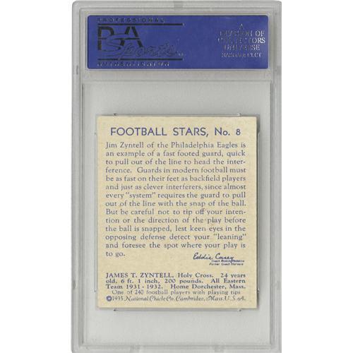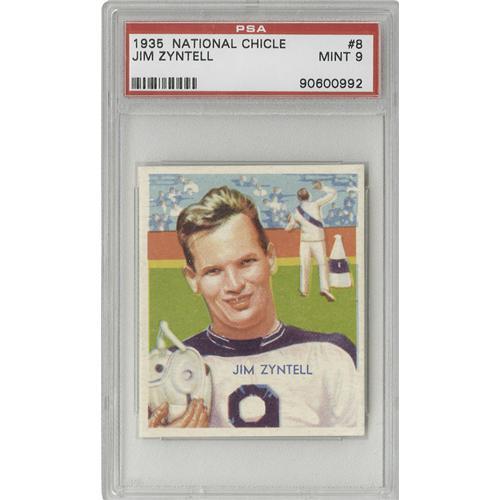 <B>1935 National Chicle Jim Zyntell #8 PSA Mint 9.</B></I> Exceptional card from the Philadelphia Eagles guard is one of only two to achieve the vaunted Mint 9 rating from PSA. Unbelievably sharp corners and fine centering put this one in a class of its own. <BR><BR><B>Important notice:</B> Heritage usually auctions material at the rate of 200-250 lots per hour. On some occasions eBay Live bid software or the Internet may not be able to keep up with the pace of the auction. We recommend placing a realistic absentee bid now as insurance to avoid disappointment. Occasionally the auctioneer may eliminate or reject an eBay Live bid, and the auctioneer may also reopen a lot after the close of the eBay live bidding (usually because we missed an audience bid), and may reject your bid even if it shows you as the winning bidder. By bidding via eBay Live, you agree that Heritage may award the lot to another bidder at its sole discretion under the circumstances described above or any other reasonable circumstances. Since eBay bids are not shown to us until we open the lot on the floor, we treat those bids just like floor bids. In most cases the floor responds before the eBay bid is presented to us, due to Internet lag time, so for consistency we have made it a policy that floor bids are always considered first over tie eBay live bids. Also please note that all Heritage lots purchased through eBay Live carry a 22.5% Buyer's Premium. Please make sure you read the Terms and Conditions before you bid. This lot is being auctioned in conjunction with a live floor auction by Heritage Galleries & Auctioneers. All final auction and invoice information will be supplied by Heritage Galleries & Auctioneers, and all other information should be considered preliminary. Lot:19256 <BR><BR><B>Winning Notification and Billing:</B> After the FINAL session in this auction is complete, Heritage will send e-mail and snail mail invoices. This process normally takes several days. All final auction and invoice information will be supplied by Heritage Galleries & Auctioneers, and all other information should be considered preliminary. <BR><BR>This auction will be conducted on a live auction floor and over the Internet through eBay Live. If you choose to place an absentee bid, please take a moment to <font color='#0000ff'><u><a href='http://pages.ebay.com/liveauctions/help/before/laabsentee.html'>learn how eBay Live absentee bidding works</a></u></font><font color='#000000'>