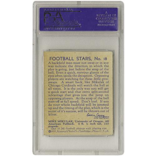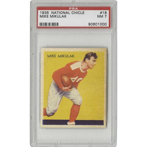 <B>1935 National Chicle Mike Mikulak #18 PSA NM 7.</B></I> Exceptional color and centering make it clear why this is the golden age of card design. Mild toning is all that separates this one from the NM-MT 8 specimens in the auction. <BR><BR><B>Important notice:</B> Heritage usually auctions material at the rate of 200-250 lots per hour. On some occasions eBay Live bid software or the Internet may not be able to keep up with the pace of the auction. We recommend placing a realistic absentee bid now as insurance to avoid disappointment. Occasionally the auctioneer may eliminate or reject an eBay Live bid, and the auctioneer may also reopen a lot after the close of the eBay live bidding (usually because we missed an audience bid), and may reject your bid even if it shows you as the winning bidder. By bidding via eBay Live, you agree that Heritage may award the lot to another bidder at its sole discretion under the circumstances described above or any other reasonable circumstances. Since eBay bids are not shown to us until we open the lot on the floor, we treat those bids just like floor bids. In most cases the floor responds before the eBay bid is presented to us, due to Internet lag time, so for consistency we have made it a policy that floor bids are always considered first over tie eBay live bids. Also please note that all Heritage lots purchased through eBay Live carry a 22.5% Buyer's Premium. Please make sure you read the Terms and Conditions before you bid. This lot is being auctioned in conjunction with a live floor auction by Heritage Galleries & Auctioneers. All final auction and invoice information will be supplied by Heritage Galleries & Auctioneers, and all other information should be considered preliminary. Lot:19264 <BR><BR><B>Winning Notification and Billing:</B> After the FINAL session in this auction is complete, Heritage will send e-mail and snail mail invoices. This process normally takes several days. All final auction and invoice information will be supplied by Heritage Galleries & Auctioneers, and all other information should be considered preliminary. <BR><BR>This auction will be conducted on a live auction floor and over the Internet through eBay Live. If you choose to place an absentee bid, please take a moment to <font color='#0000ff'><u><a href='http://pages.ebay.com/liveauctions/help/before/laabsentee.html'>learn how eBay Live absentee bidding works</a></u></font><font color='#000000'>