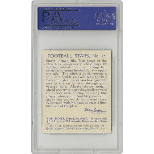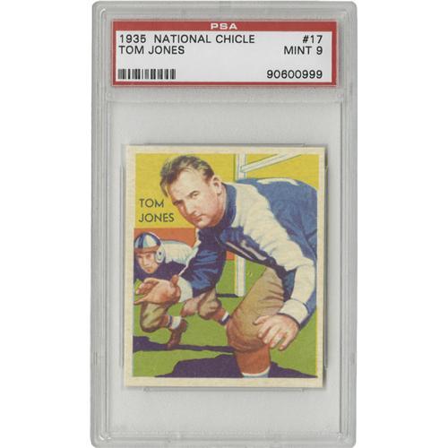 <B>1935 National Chicle Tom Jones #17 PSA Mint 9.</B></I> Despite the Las Vegas lounge singer's statement to the contrary, it most certainly is unusual to find a card from this era in such pristine condition. In fact, only seventy cards from the 1935 National Chicle set have ever achieved a Mint 9 or better rating. This one's as close to pack fresh as you'll ever find from a seventy-year old set. <BR><BR><B>Important notice:</B> Heritage usually auctions material at the rate of 200-250 lots per hour. On some occasions eBay Live bid software or the Internet may not be able to keep up with the pace of the auction. We recommend placing a realistic absentee bid now as insurance to avoid disappointment. Occasionally the auctioneer may eliminate or reject an eBay Live bid, and the auctioneer may also reopen a lot after the close of the eBay live bidding (usually because we missed an audience bid), and may reject your bid even if it shows you as the winning bidder. By bidding via eBay Live, you agree that Heritage may award the lot to another bidder at its sole discretion under the circumstances described above or any other reasonable circumstances. Since eBay bids are not shown to us until we open the lot on the floor, we treat those bids just like floor bids. In most cases the floor responds before the eBay bid is presented to us, due to Internet lag time, so for consistency we have made it a policy that floor bids are always considered first over tie eBay live bids. Also please note that all Heritage lots purchased through eBay Live carry a 22.5% Buyer's Premium. Please make sure you read the Terms and Conditions before you bid. This lot is being auctioned in conjunction with a live floor auction by Heritage Galleries & Auctioneers. All final auction and invoice information will be supplied by Heritage Galleries & Auctioneers, and all other information should be considered preliminary. Lot:19263 <BR><BR><B>Winning Notification and Billing:</B> After the FINAL session in this auction is complete, Heritage will send e-mail and snail mail invoices. This process normally takes several days. All final auction and invoice information will be supplied by Heritage Galleries & Auctioneers, and all other information should be considered preliminary. <BR><BR>This auction will be conducted on a live auction floor and over the Internet through eBay Live. If you choose to place an absentee bid, please take a moment to <font color='#0000ff'><u><a href='http://pages.ebay.com/liveauctions/help/before/laabsentee.html'>learn how eBay Live absentee bidding works</a></u></font><font color='#000000'>