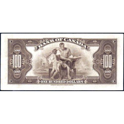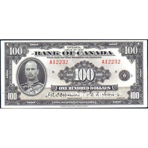 1935 One Hundred Dollars English, BC-15 Serial Number A12232 D, AU-Uncirculated. A fully original example, very slightly off centre toward the top