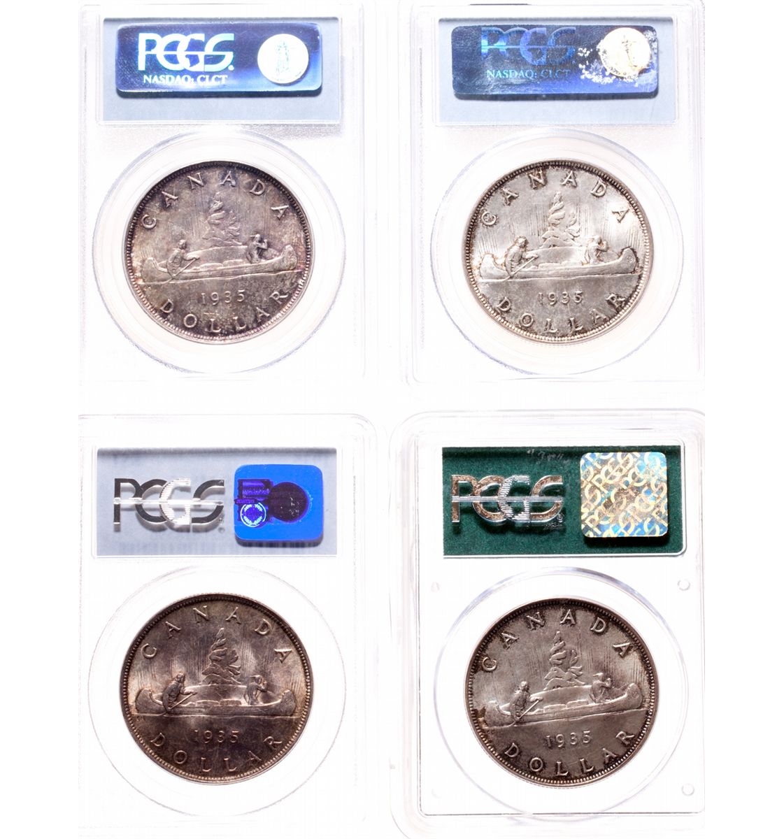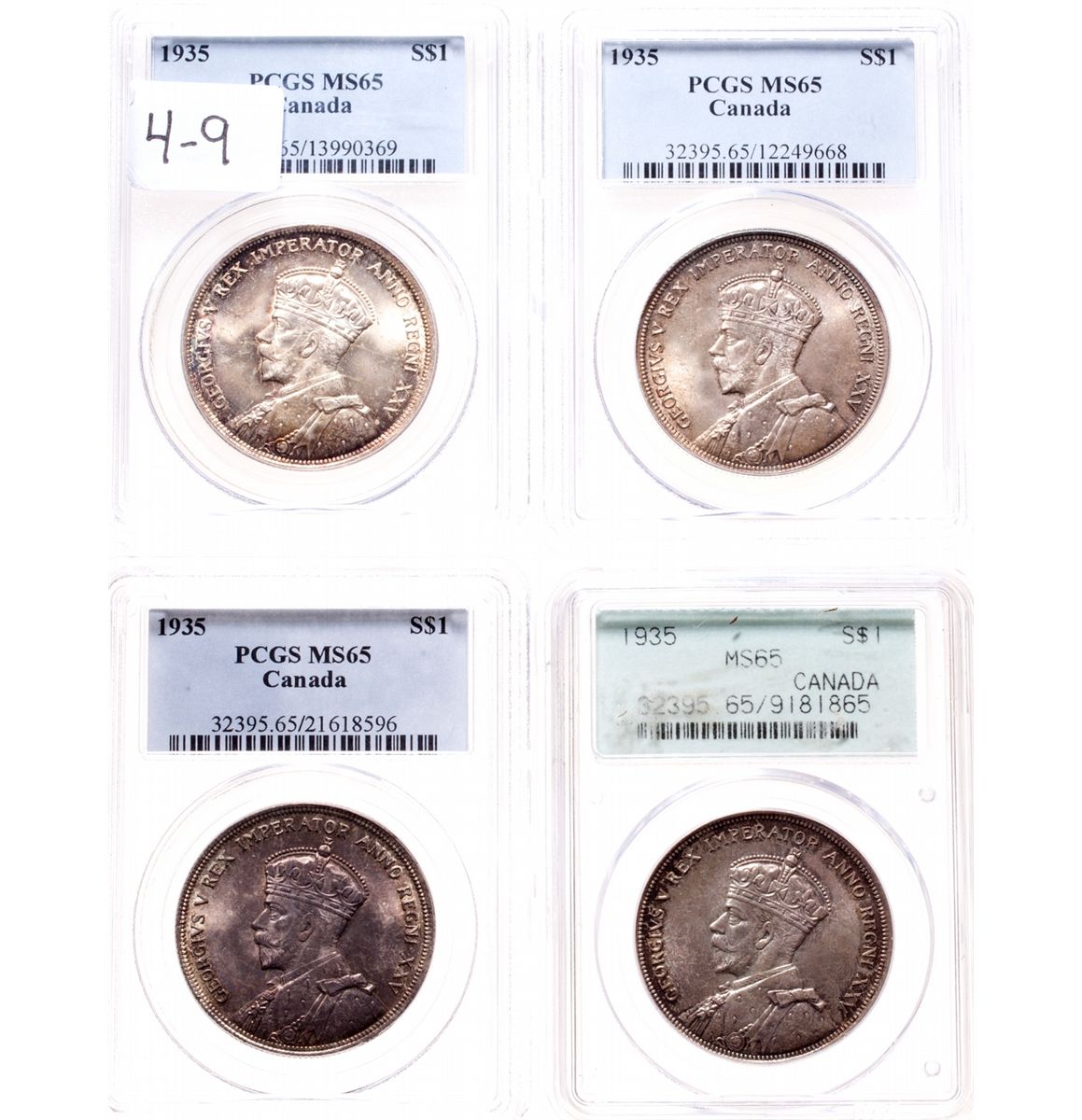 1935. PCGS graded Mint State-65. Lot of four (4) Gem dollars, all with outstanding medium heavy, premium quality toning and all with great 'eye appeal'.