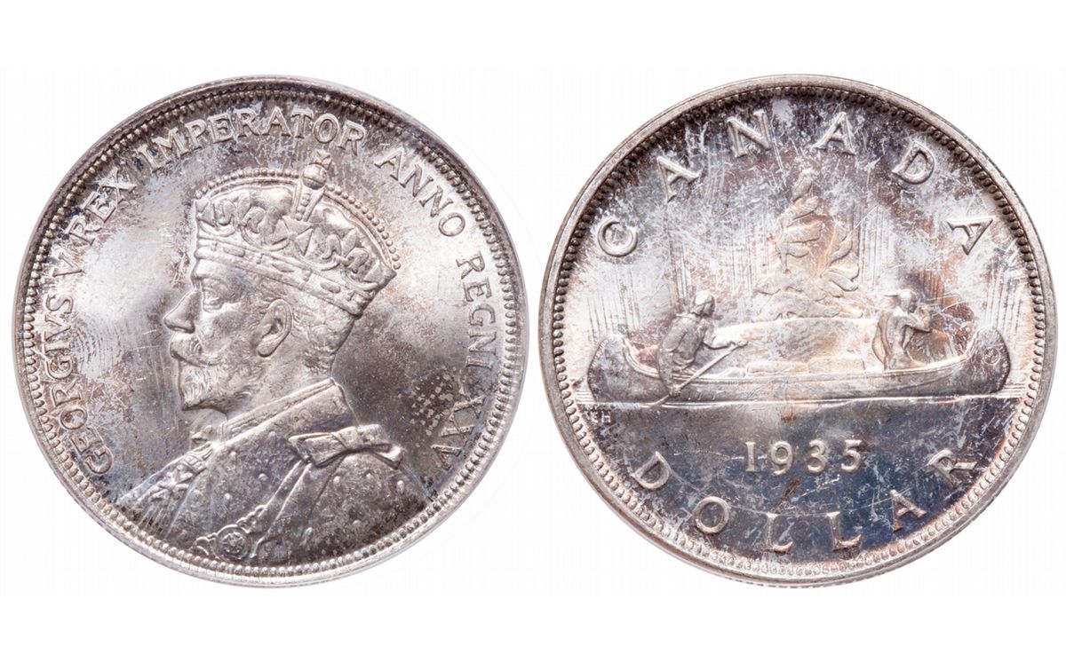 1935. PCGS graded Mint State-66. This gem dollar exhibits outstanding light, multi-hued rainbow toning. Great 'eye appeal'. Great fields and surfaces. A wonderful Gem.