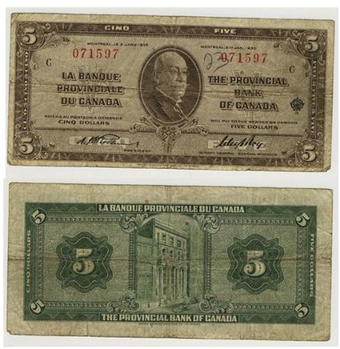 Chartered Banknote, design of JB Rolland dated Montreal 2 January 1935. Average circulated condition, light soiling and a strong vertical & horizontal centre fold. No tears, 1 pencil mark on face with Serial #071