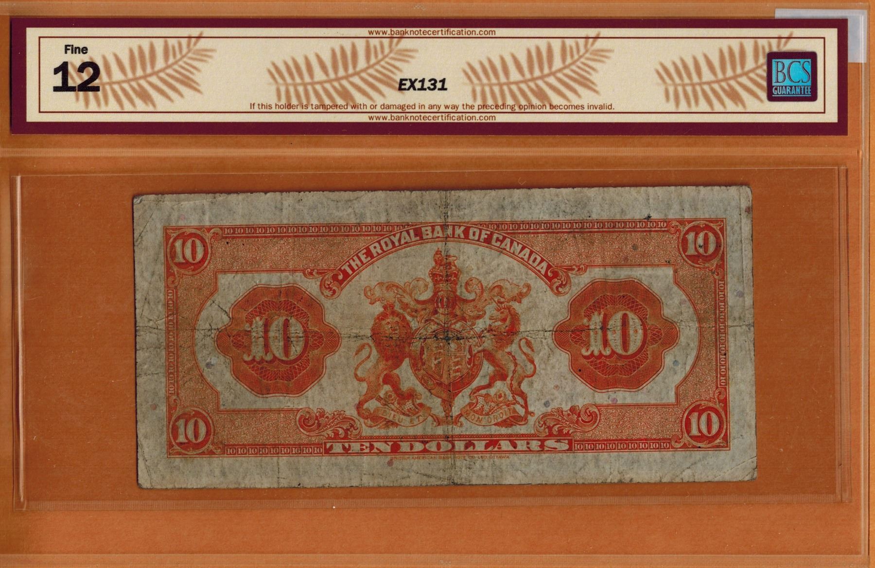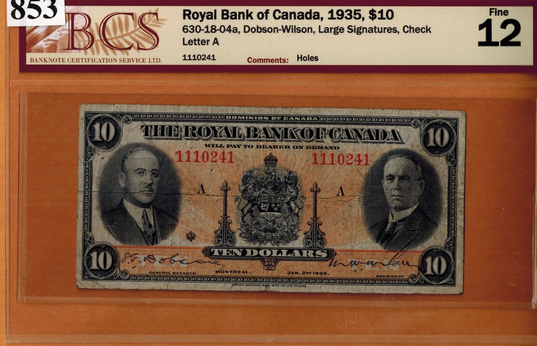 1935 ROYAL BANK OF CANADA $10 BANKNOTE - BCS GRADED - FINE 12