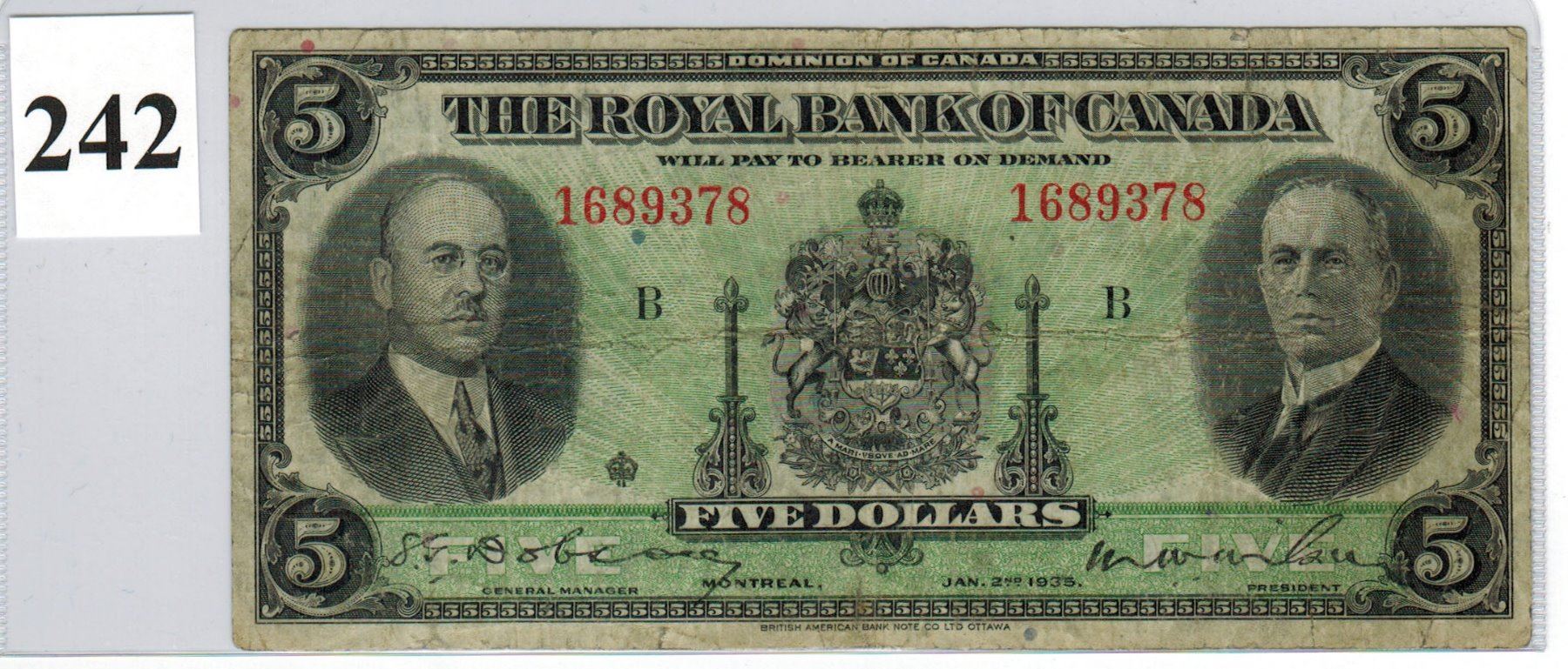 1935 ROYAL BANK OF CANADA - $5 BANKNOTE - SER. # 1689378