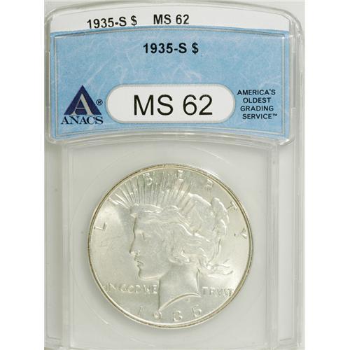 <B>1935-S $1 MS62 ANACS.</B></I> NGC Census: (215/1550). PCGS Population (389/2515). Mintage: 1,964,000. Numismedia Wsl. Price: $167. (#7379)<BR><BR><b>Shipping:</b> Coins & Currency (<a target="_blank" href="http://www.heritageauctions.com/common/shipping.php">view shipping information</a>)