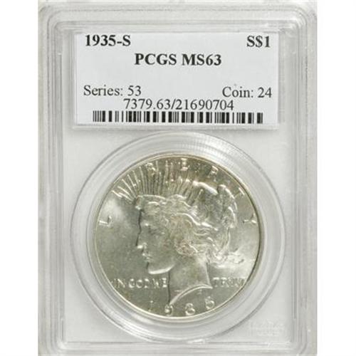 <B>1935-S $1 MS63 PCGS.</B></I> PCGS Population (856/1771). NGC Census: (464/1160). Mintage: 1,964,000. Numismedia Wsl. Price for NGC/PCGS coin in MS63: $320. (#7379)<BR><BR><B>Coin Engraver:</B> Anthony de Francisci<BR><BR><b>Shipping:</b> Coins & Currency (<a target="_blank" href="http://www.heritageauctions.com/common/shipping.php">view shipping information</a>)