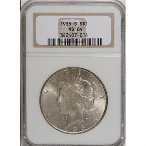 <B>1935-S $1 MS64 NGC.</B></I> . NGC Census: (774/395). PCGS Population (1155/636). Mintage: 1,964,000. Numismedia Wsl. Price for NGC/PCGS coin in MS64: $510. (#7379)<BR><BR><B>Coin Engraver:</B> Anthony de Francisci<BR><BR><b>Shipping:</b> Coins & Currency (<a target="_blank" href="http://www.heritageauctions.com/common/shipping.php">view shipping information</a>)