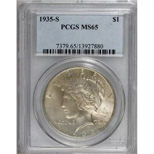 <B>1935-S $1 MS65 PCGS.</B></I> This '35-S comes well struck, as is the norm for the issue, and displays a thin coat of champagne-gold color over highly lustrous surfaces. A few minuscule marks preclude what might possibly be a higher grade.<BR><BR><B>Coin Engraver:</B> Anthony de Francisci<BR><BR><b>Shipping:</b> Coins & Currency (<a target="_blank" href="http://www.heritageauctions.com/common/shipping.php">view shipping information</a>)