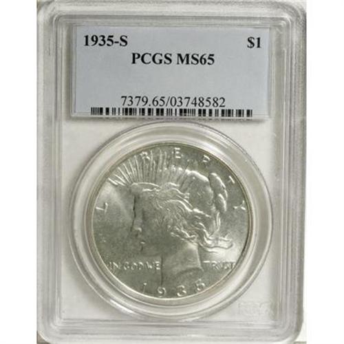 <B>1935-S $1 MS65 PCGS.</B></I> Three rays beneath ONE. An untoned and precisely struck Gem with clean surfaces and good luster. A better date from a mintage of less than 2 million pieces.<BR><BR><B>Coin Engraver:</B> Anthony de Francisci<BR><BR><b>Shipping:</b> Coins & Currency (<a target="_blank" href="http://www.heritageauctions.com/common/shipping.php">view shipping information</a>)