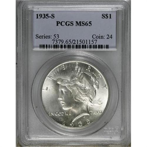 <B>1935-S $1 MS65 PCGS.</B></I> PCGS Population (531/112). NGC Census: (343/49). Mintage: 1,964,000. Numismedia Wsl. Price for NGC/PCGS coin in MS65: $975. (#7379)<BR><BR><B>Coin Engraver:</B> Anthony de Francisci<BR><BR><b>Shipping:</b> Coins & Currency (<a target="_blank" href="http://www.heritageauctions.com/common/shipping.php">view shipping information</a>)