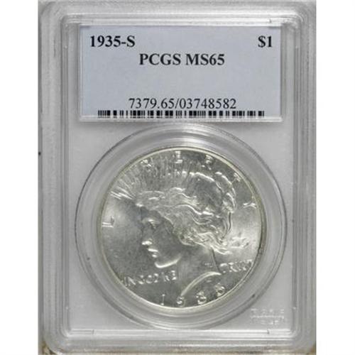 <B>1935-S $1 MS65 PCGS.</B></I> Crisply detailed with surprisingly subtle luster on the essentially silver-white surfaces. The overall appearance is stark, with only a few occasional flaws on each side.<BR><BR><B>Coin Engraver:</B> Anthony de Francisci<BR><BR><b>Shipping:</b> Coins & Currency (<a target="_blank" href="http://www.heritageauctions.com/common/shipping.php">view shipping information</a>)