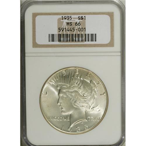 <B>1935 S$1 MS66 NGC.</B></I> Satiny with sharply detailed devices. Faint rose toning appears on Liberty's neck and the eagle's feathers. A high-quality example of this elusive late-date issue. Census: 53 in 66, 4 finer (1/07).<BR><BR><b>Shipping:</b> Coins & Currency (<a target="_blank" href="http://www.heritageauctions.com/common/shipping.php">view shipping information</a>)
