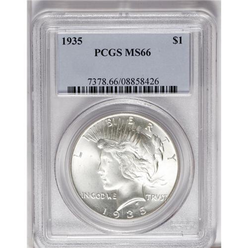 <B>1935<img border='0' src='http://www.heritagecoins.com/images/star.gif' width=10 height=10>$1> MS66 PCGS.</B></I> Free of deep abrasions, with effulgent luster on both sides. A slight amount of planchet chatter (as struck) is noted in the central design features, but does not detract from the appeal.