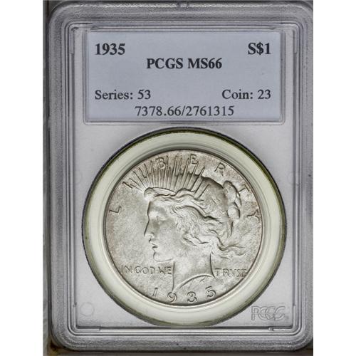 <B>1935<img border='0' src='http://www.heritagecoins.com/images/star.gif' width=10 height=10>$1> MS66 PCGS.</B></I> Remarkably clean and highly lustrous. The 1935 is a scarcer date in the Peace dollar series and is generally not located in such a superlative grade. This coin shows brownish patina and is virtually abrasion-free. Population: 131 in 66, 0 finer (4/06).