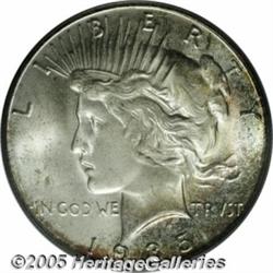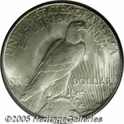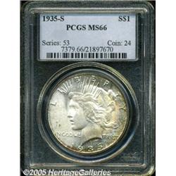 <B>1935-S<img border='0' src='http://www.heritagecoins.com/images/star.gif' width=10 height=10>$1 MS66 PCGS.</B></I> This is an impressive Premium Gem example with frosty silver luster. The obverse has a crescent of iridescent toning along the right side and below, and the balance of surfaces on both sides are silvery-white with subtle champagne color. This Gem is sharply struck and among the finest certified. In fact, PCGS has only graded one higher quality example. Population: 91 in 66, 1 finer (2/05).