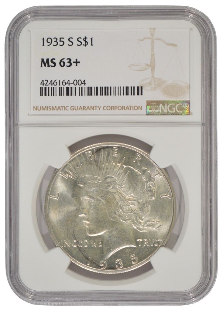 One 1935-S $1 Peace Silver Dollar Coin NGC MS63+.