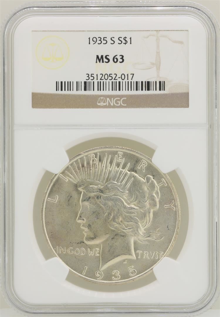 One 1935-S $1 Peace Silver Dollar Coin NGC MS63. NGC Certified.