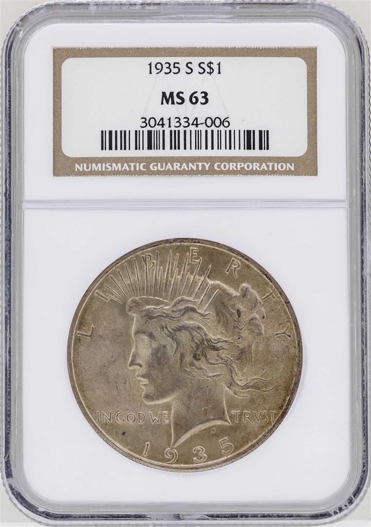 One 1935-S $1 Peace Silver Dollar Coin NGC MS63. NGC Certified.