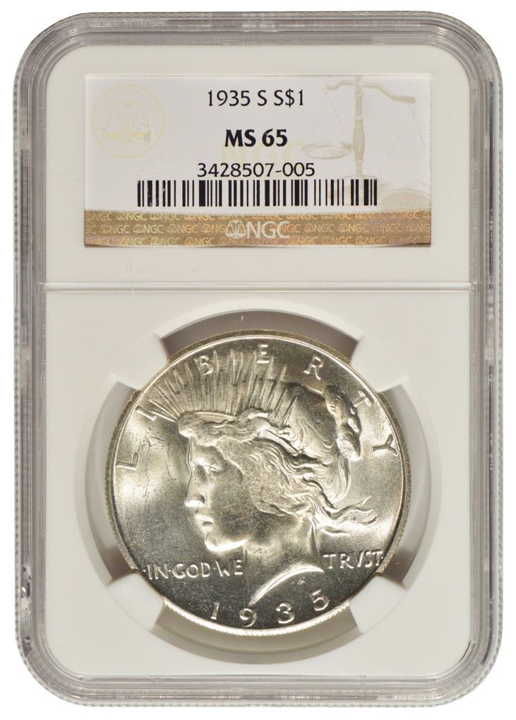 One 1935-S $1 Peace Silver Dollar Coin NGC MS65.