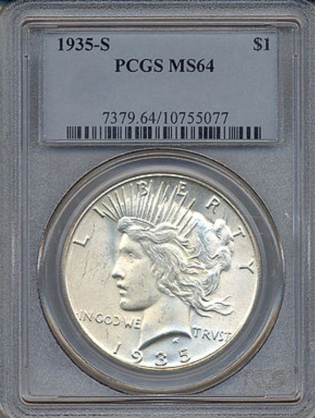One 1935-S $1 Peace Silver Dollar Coin PCGS MS64.
