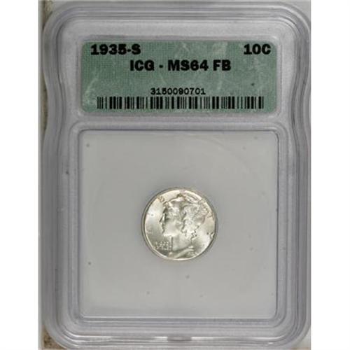 <B>1935-S 10C MS64 Full Bands ICG.</B></I> NGC Census: (41/136). PCGS Population (129/403). Mintage: 15,840,000. Numismedia Wsl. Price for NGC/PCGS coin in MS64: $129. (#4997)<BR><BR><B>Coin Engraver:</B> Adolph A. Weinman<BR><BR><b>Shipping:</b> Coins & Currency (<a target="_blank" href="http://www.heritageauctions.com/common/shipping.php">view shipping information</a>)